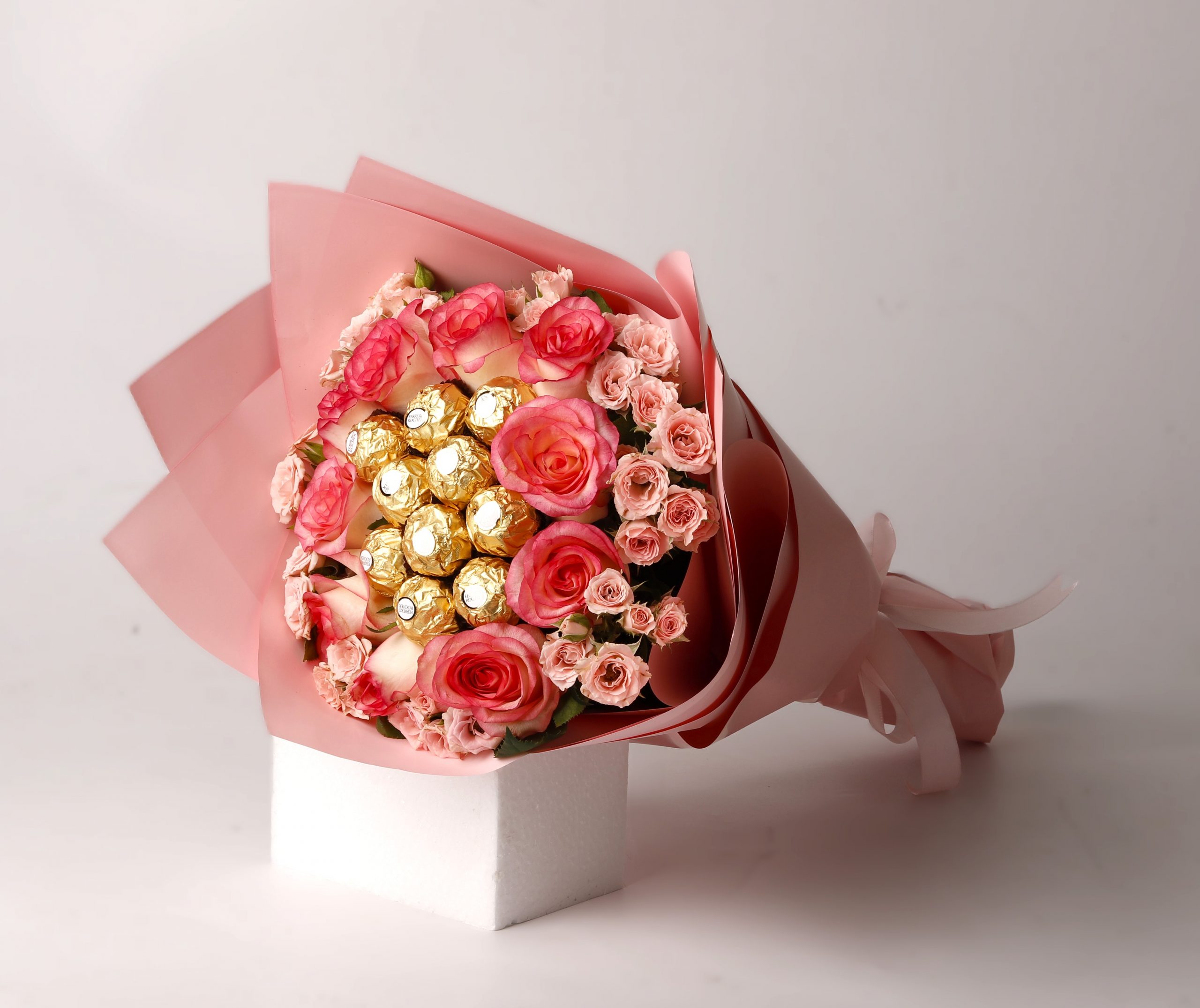 “Indulge in the enchanting allure of our Pink Elegance Delight. This exquisite bouquet of pink roses, a symbol of grace and admiration, is paired with the luscious decadence of Ferrero Rocher chocolates. Perfect for expressing love and celebrating moments of pure sweetness, this delightful combination is a token of elegance and affection.”